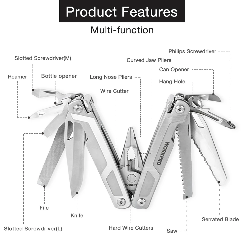 Жесткий, надежный и простой в обращении, вот что мы хотели разработать и, наконец, представлено на этом Workpro сверхмощном многофункциональном инструменте. Простой стиль и качественная конструкция делают этот многофункциональный инструмент безупречным в самых сложных и неблагоприятных условиях.