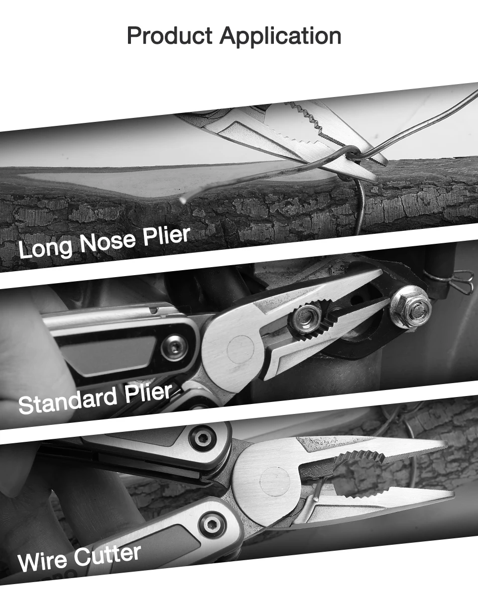 На головке инструмента есть Длинные плоскогубцы, изогнутые плоскогубцы, резец проволоки в верхней части v-образного резака и резец из жесткого провода в нижней части v-образного резака.