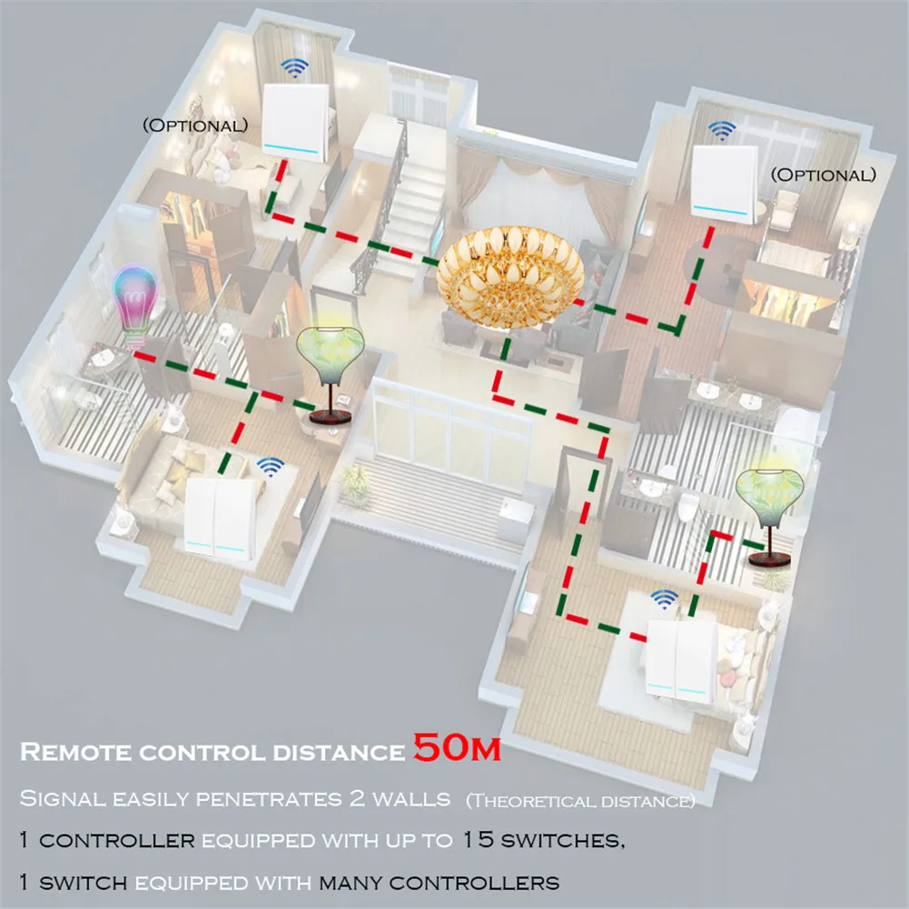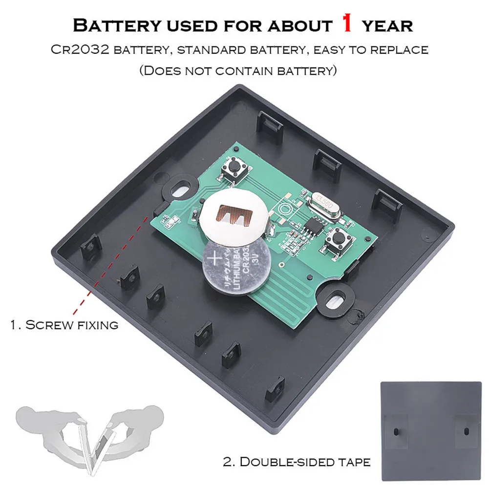 1. Рабочее напряжение: 3 В постоянного тока 2. Рабочая частота: 433,92 МГц 3. Мощность передачи: <10 мВт 4. Дистанция дистанционного управления: <50 метров (расстояние в помещении) 5. Метод работы: беспроводной пульт дистанционного управления 6. Метод кодирования: код обучения 7. Метод модуляции: ASK 8. Рабочая температура:-10 градусов C ~ + 70 градусов C 9. Размер: 86*86 (мм) 10. Используйте 1 шт. щелочную батарею CR2032 (в комплект не входит батарея), срок службы около 12 месяцев. Срок службы и частота использования связаны. Время может занять больше времени