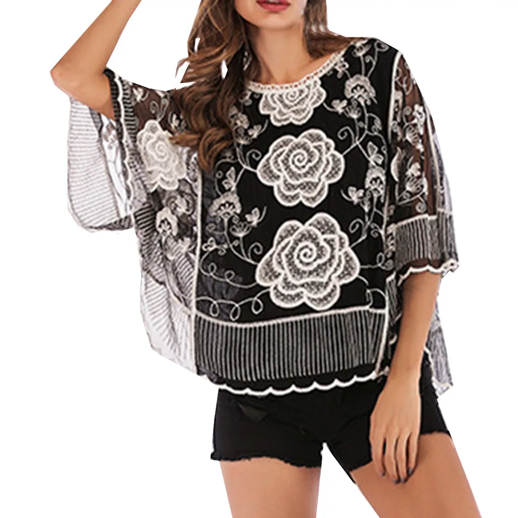 Женская кружевная рубашка с вырезами и вышивкой в виде бабочек, Свободный Топ с круглым воротником