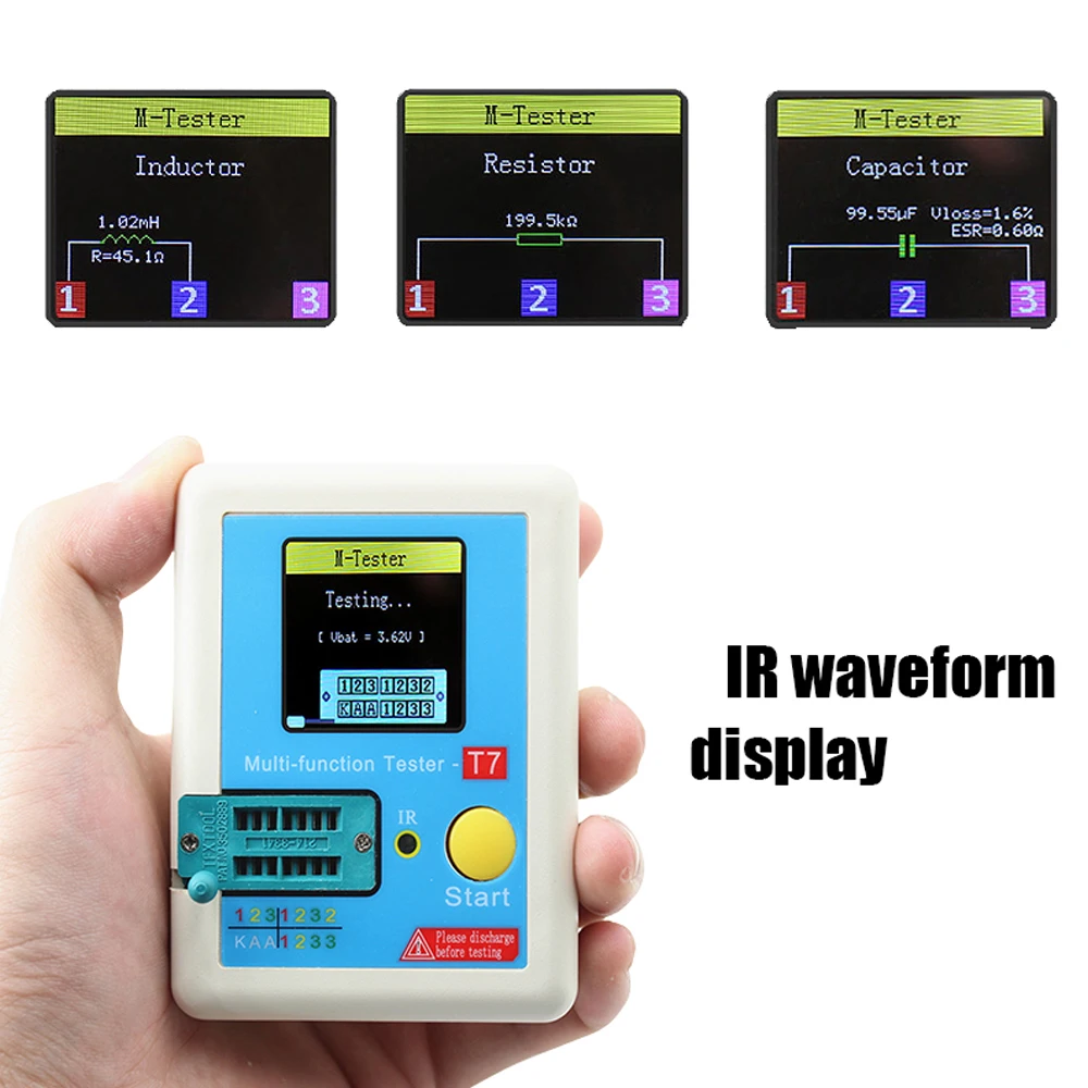 Полноцветный дисплей, многофункциональный инструмент для тестирования, может измерять транзистор, диод, резистор, конденсатор, индуктор, тиристор, трубка с полевым эффектом, трубка регулятора, двойной диод, светильник-излучающие диоды, инфракрасный декодирующий. Может измерять напряжение, встроенный литиевый аккумулятор, длительный срок службы батареи.