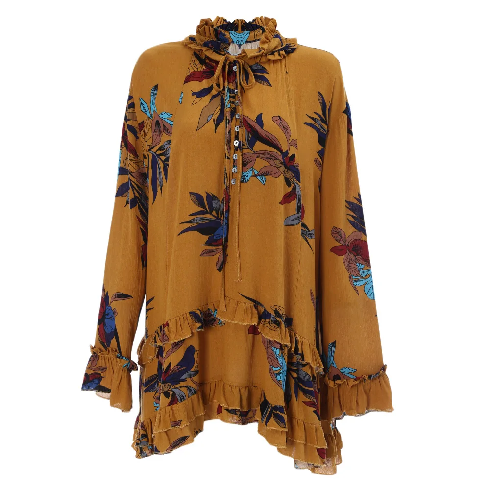 Летнее женское платье с цветочным принтом и рюшами, с галстуком-бабочкой, с воротником-стойкой, с длинным рукавом, свободное, повседневное, бохо, длинное, туника, короткое платье, распродажа