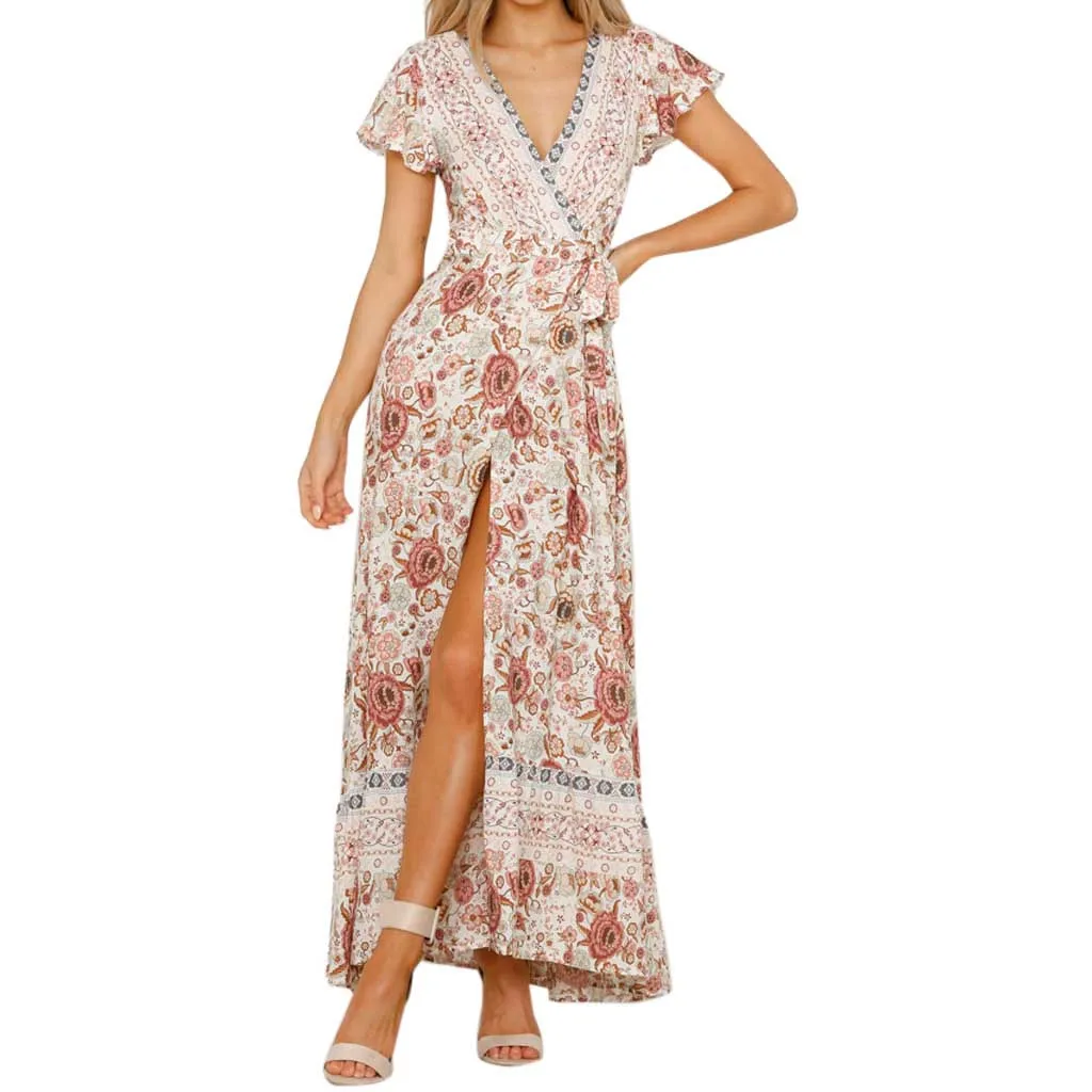 Модное женское сексуальное богемное Платье с v-образным вырезом и цветочным принтом, летнее вечернее пляжное длинное Платье, свободный сарафан для вечеринки, Wd4