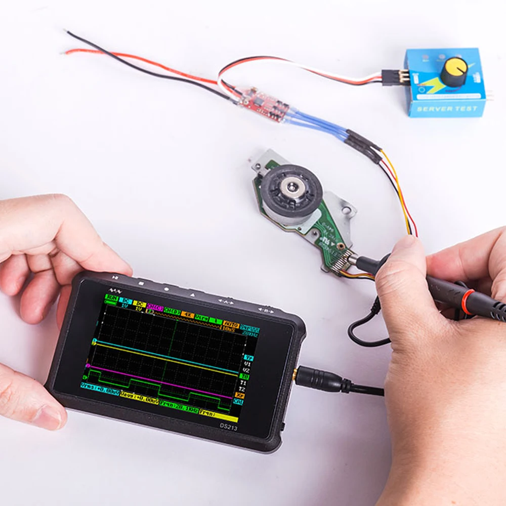 Мини DS213 цифровой Сверхлегкий Осциллограф USB Перезаряжаемый Ручной осциллограф Набор 15 МГц аналоговая полоса пропускания 100 м Частота дискретизации 400*240 Разрешение со встроенной литиевой батареей Это карманный легкий осциллограф с частотой дискретизации 100 м и пропускной способностью 15 МГц. Будь то DIY или научно-исследовательское образование, техническое обслуживание автомобилей, техническое обслуживание бытовой техники и так далее-все это хороший выбор.