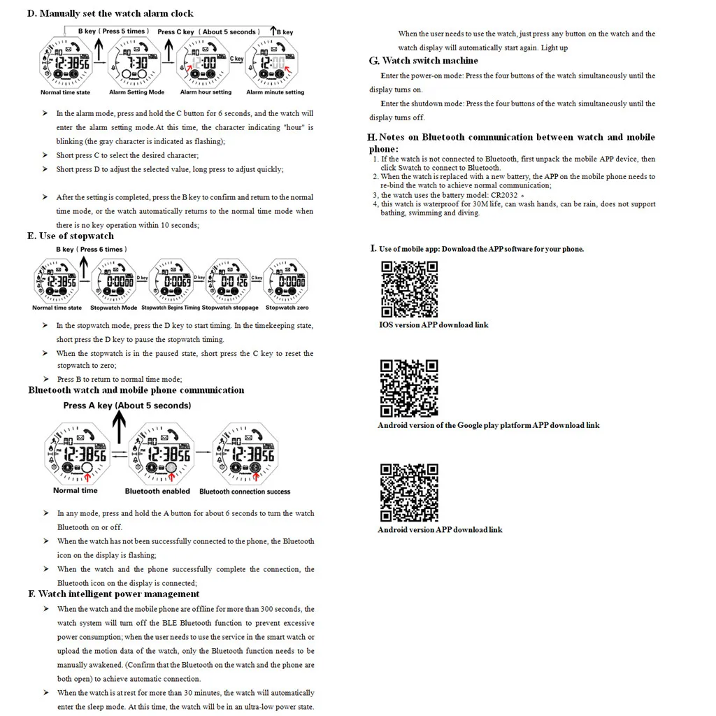 W/P:30M водонепроницаемыйЧасы с функцией секундомера, будильника, дисплея освещения, времени изменения размера воды, недели, даты, месяца дисплея,Muldfunctional sport, 12/24 ежечасный, Pedomter, калории, расстояние, aimes BLuetooth 4,0, удаленное сообщение камеры, напоминание о звонке, подключение к мобильному приложению.