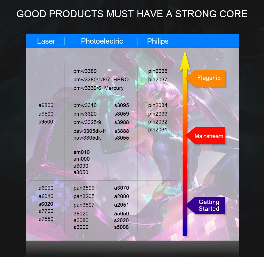 Основная модель нашей мыши P3360, которая является лучшим ядром;> 20G ACC.12000 FPS; Частота опроса 1000 Гц; высокоточный датчик обеспечивает точную точность во время игры