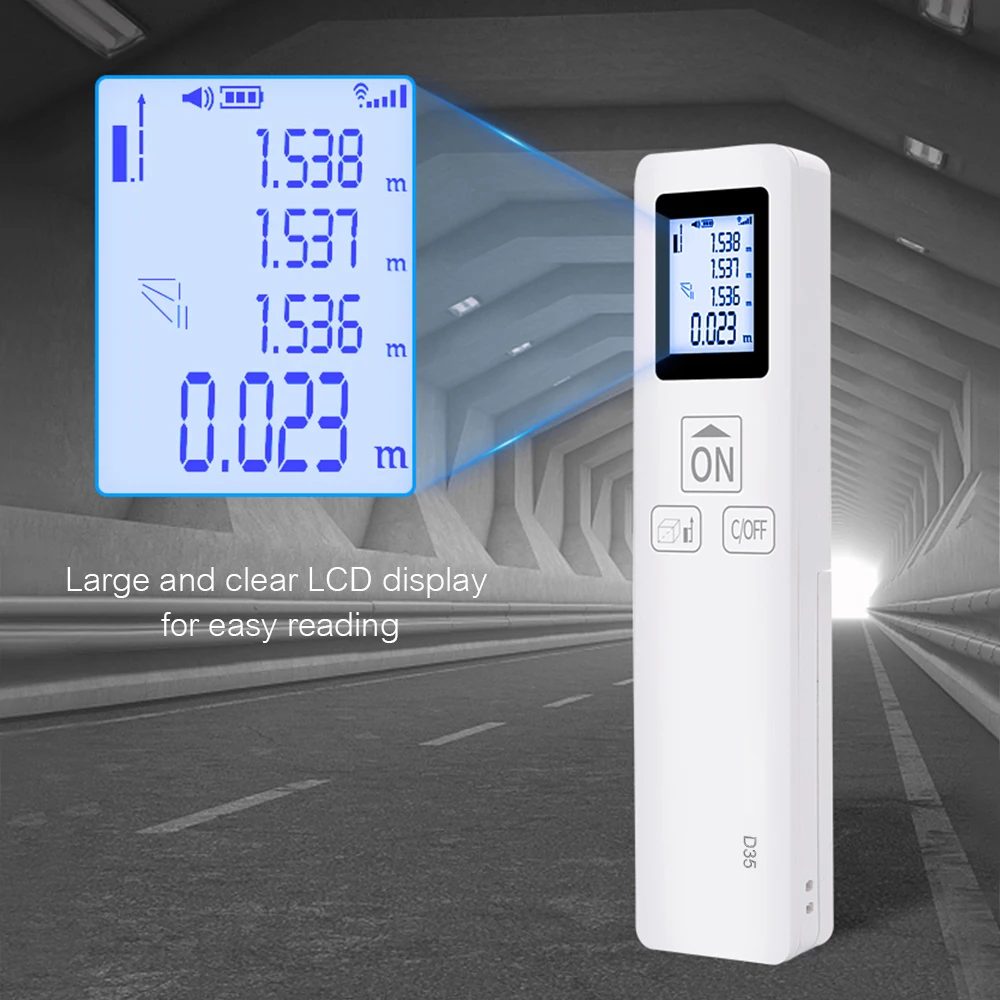 Она обеспечивает высокую точность:Индикатор для измерения знака данных, уровня заряда батареи, зуммера, мощности сигнала. Быстрое измерение расстояния, площади и объема с простой работой, дальность измерения 35 м и высокая точность: ± 3 мм.