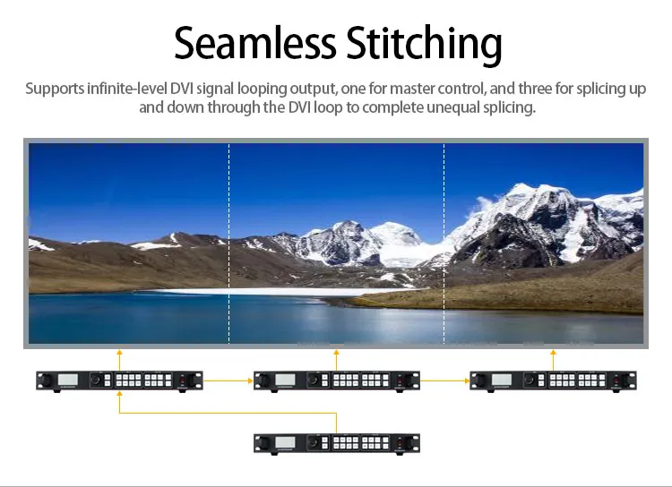 Плавно Переключайте любой канал 8/9-канальный цифровой-аналоговый видео вход 1 DP, 1 DVI, 2HDMI, 2 VGA, 2 AV, 1SDI(EXT), 1 USB(EXT) Функция обнаружения сигнала ● Поддержка аудиовыхода > Поддержка большого соединения 10x10 ● Поддержка пользовательского разрешения на выходе 2304x1152 @ 60 Гц, 2560x816 @ 60 Гц, 3840x640 @ 60 Гц Технология предварительного переключения ⑤ 34 показывает эффект произвольного переключения → Режим сохранения и отзыва Черный экран и замораживание с одной клавишей ⑤ Настройки регулировки ручки ►Поддержка управления интерфейсом RS232 > DVI-Loop Out удобный для многосплайсинга