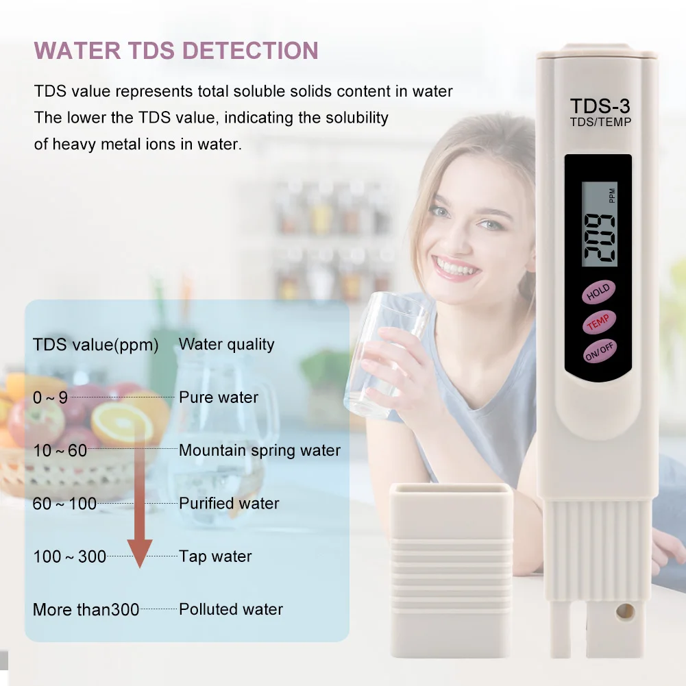 1 、 TDS метр Измеритель TDS (aka ppm pen, тестер питательных веществ, tds stick)-это недорогой и удобный цифровой инструмент для мгновенной проверки общего качества воды. TDS = общие растворенные твердые вещества, которые являются любой солью, металлом или минералом в воде. С помощью кнопки TDS может сообщить вам общий уровень чистоты воды, который будет отображаться на экране в ppm (части на миллион). Чем ниже уровень TDS, тем чище вода, и 0 ppm является чистым H2O. TDS отлично подходит для проверки качества водопроводной воды или для изменения фильтра. (Измеритель не тестирует биологические загрязнители.) TDS-это отличный инструмент для питьевой воды, фильтрации и очистки воды, коллоидного серебра, гидропоники (проверьте свои питательные вещества), аквариумов, систем RO/DI, бассейнов и спа-салонов, коммерческое и промышленное применение и многое другое. TDS-это прочная модель, которая включает защитный чехол для переноски. Это самый популярный в мире портативный измеритель TDS для профессионалов отрасли. Ts идеально подходит для коммерческого использования, включает в себя чехол с зажимом для ремня функция удержания: экономит измерения для удобного чтения и записи высокоэффективный и точный благодаря передовой технологии микропроцессора Встроенный цифровой термометр, дисплей: большой и легко читаемый ЖК-экран. Цифровой измеритель воды AquaLutio TDS идеально подходит для тестирования таких приложений, как гидропоника и садоводство, бассейны и спа, аквариумы и рифы, ионизаторы воды, фильтр для воды. Питьевая вода и многое другое. TDS счетчик воды идеально подходит для тестирования приложений идеальная питьевая вода, фильтр для воды, угольные фильтры, Весенняя вода, жесткая вода, средняя водопроводная вода, фильтр для воды холодильника, фильтр для воды, фильтр для воды brita, обратный осмос, фильтр обратного осмоса
