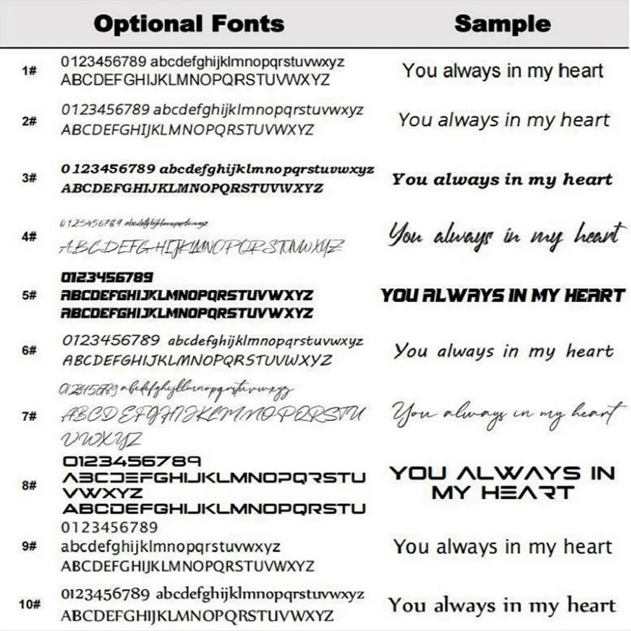 1. Выбранные элементы (стиль/цвет/длина...)----- добавить в корзину); 2. Оставьте сообщение в поле "Примечания" или "окно"; *** Текст-то, что вы хотите выгравировать (имя, буквы, фразы, ...) 3. Выберите способ доставки и оформление заказа. 4. Если вы забыли оставить отметку, отправьте нам сообщение в службу поддержки клиентов. Например: Текст фраз: Вера, поверьте себе. Шрифт 1 # Символ A1 Примечание: Если нет сообщения или заметки, мы вышлем вам пустой