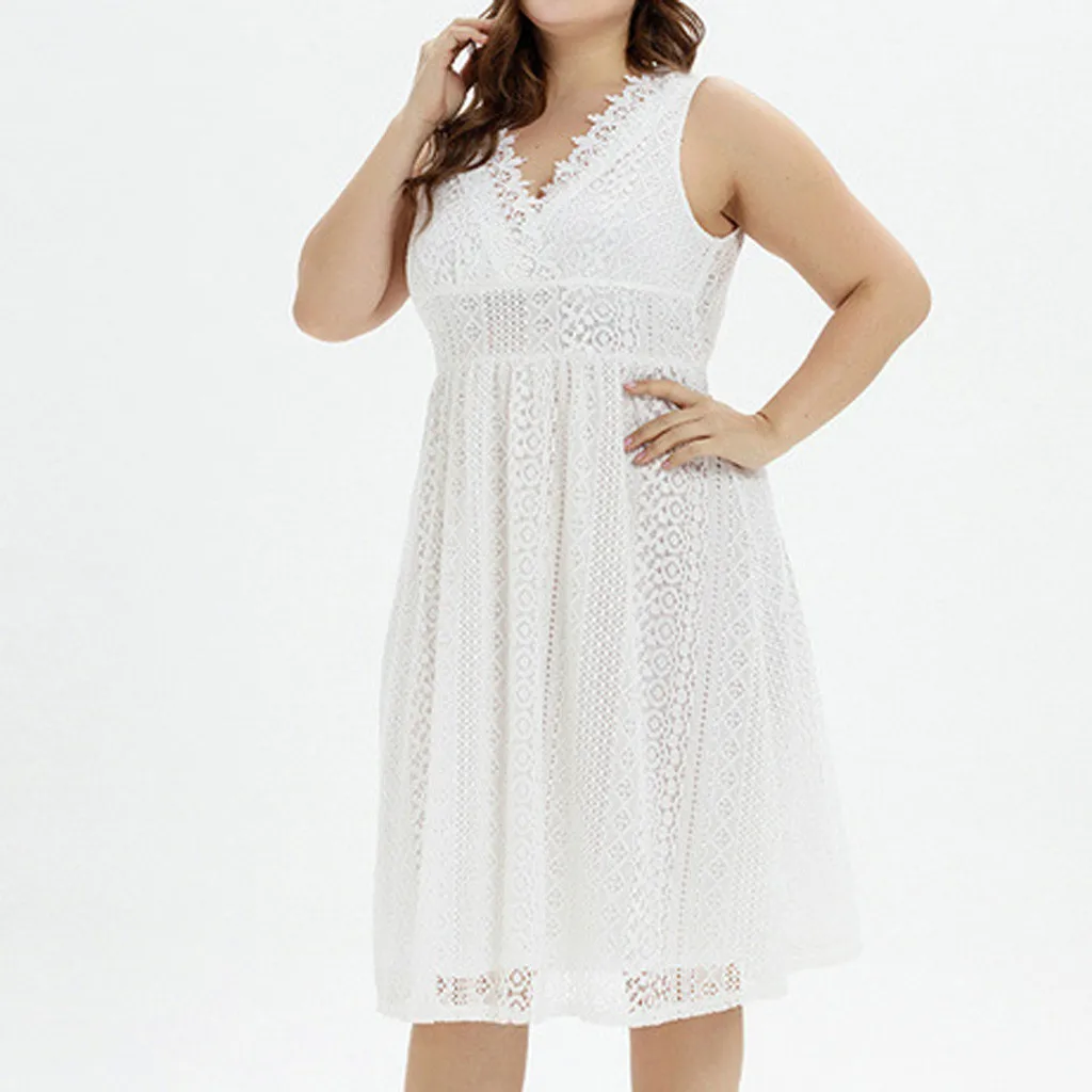 1. Особенности: Модный сексуальный, большой размер, однотонный, без рукавов, v-образный вырез, кружево, выдалбливают, платье.