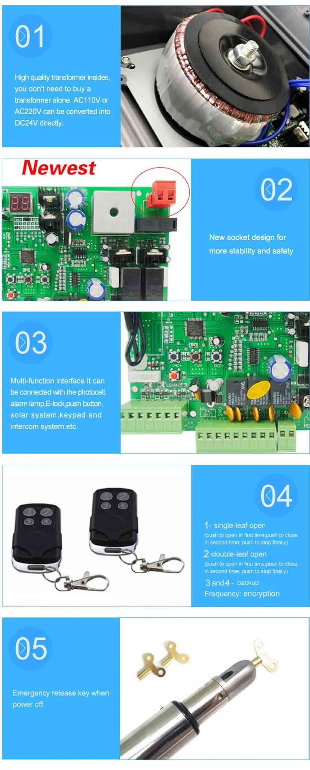 Цифровой светодиодный меню обеспечивает легкую настройку, подключи и работай Доступно для установки пешеходного режима Регулируемое время работы Регулируемая чувствительность сопротивления Настройка времени автоматического закрытия Терминал доступен для циклического детектора, фотоэлемента, кнопки, клавиатуры, оборудования контроля доступа и т. Д. Пользовательский код прокатки делает систему более безопасной, высокая Противоугонная производительность