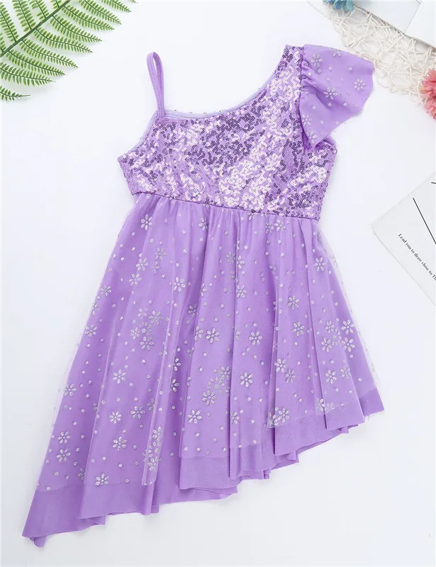 Двухслойная юбка с асимметричным подолом прикрепляется к талии. Верхний сетчатый слой украшен блестящими цветами. Красивая Одежда для танцев для вашей девочки.