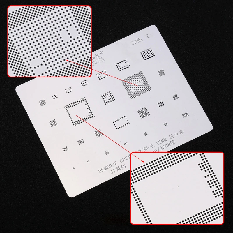 Описание: Высокое качество BGA трафарет. Специально разработан для Samsung S7 MSM8996 процессор G9300 G9350 G9308 Сделайте ремонт проще. Материал: Нержавеющая сталь Толщина: 0,12 мм