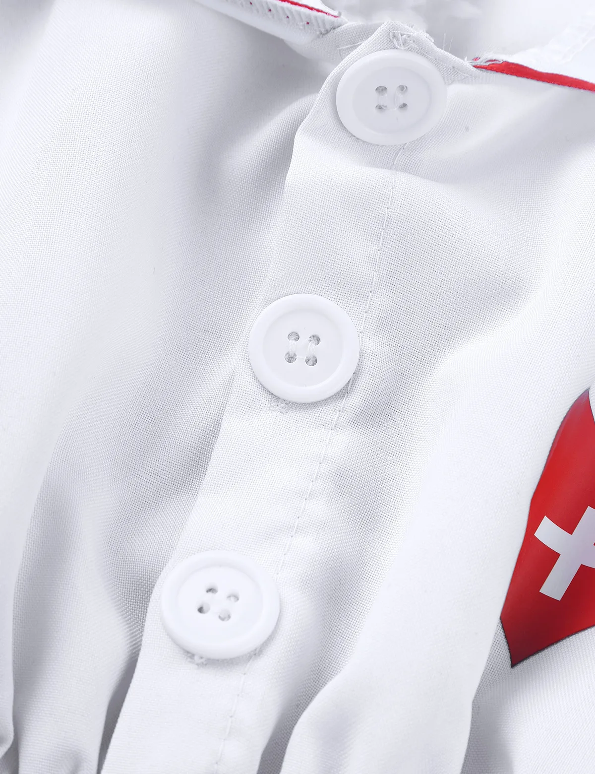 Короткие рукава, дизайн с отворотами, спереди застежка на пуговицах для легкой одевания, левая грудь с логотипом Красного Креста.
