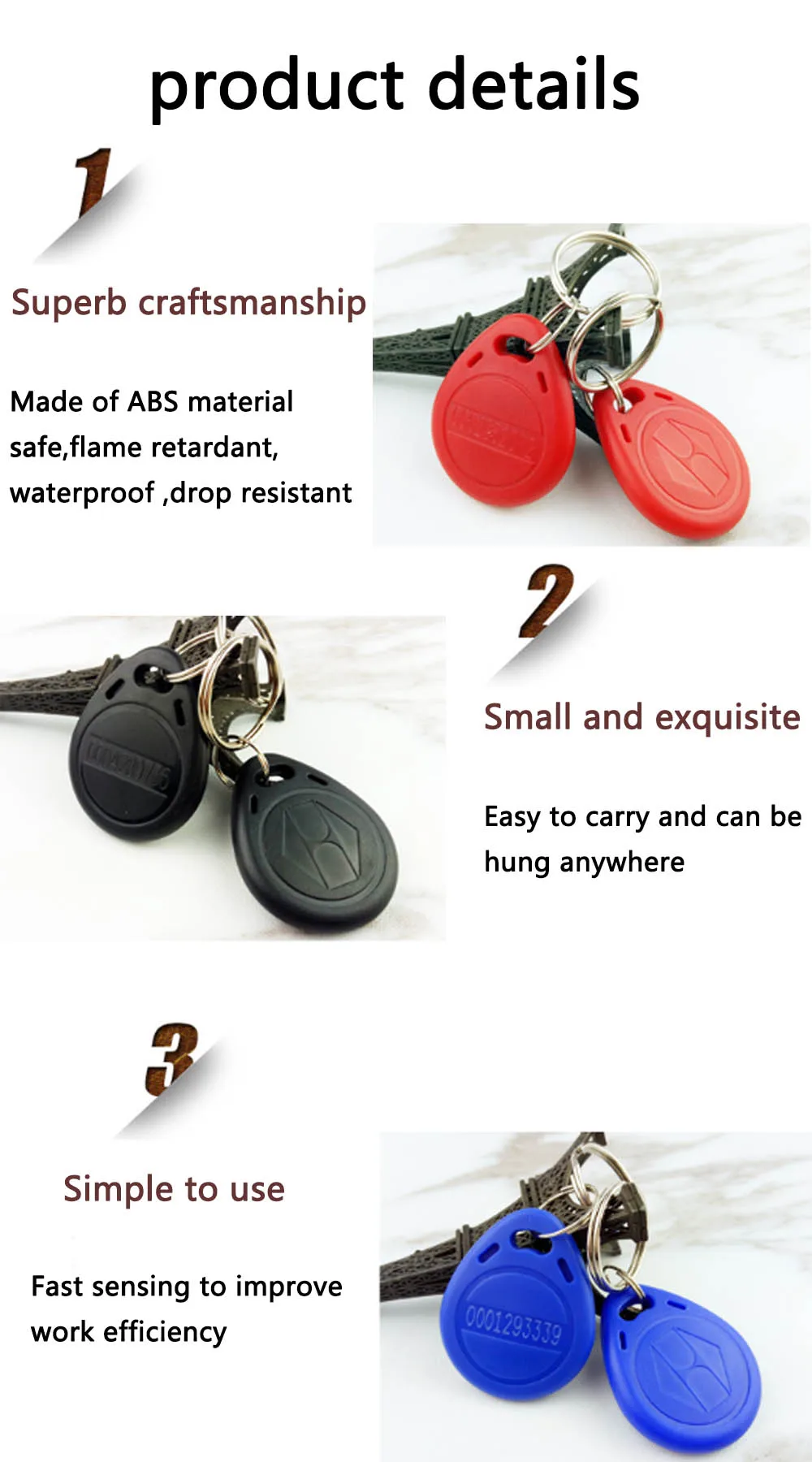 • Водонепроницаемость • В комплект входит кольцо для ключей. • Совместимость со всеми считывателями RFID для получения доступа • Каждый Токен предварительно запрограммирован с уникальным идентификатором, который является лазерной печатью на нем