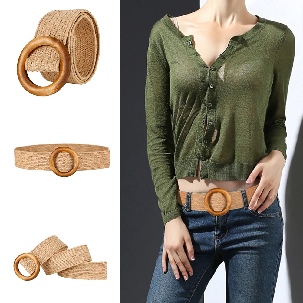 Женские плетеные соломенные ремень круглый деревянный пряжки сплетенные PP трава Повседневное пояс