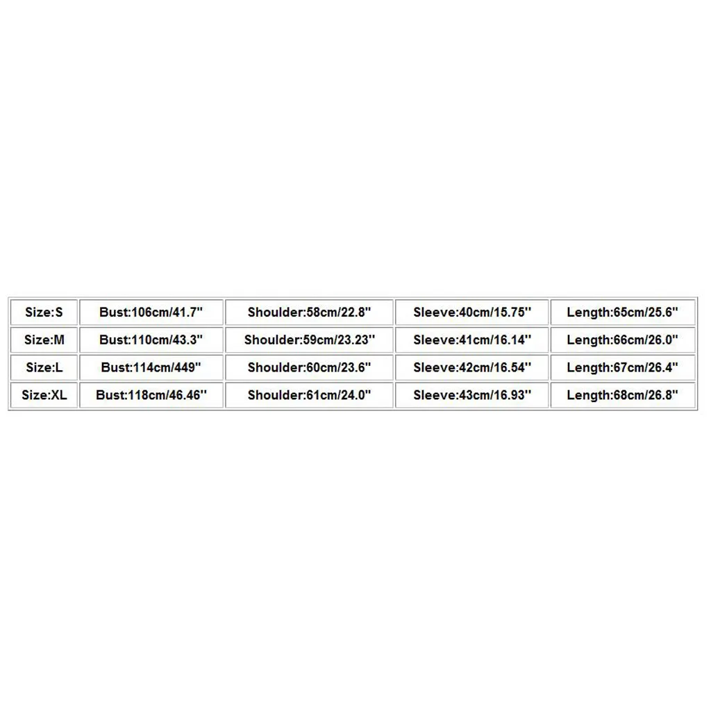 Размер Бюст Плечо Рукав Длина S 106 см/41,7" 58 см/22,8" 40 см/15,75'' 65 см/25,6" М 110 см/43,3" 59 см/23,23'' 41 см/16,14'' 66 см/26,0" L 114 см/449" 60 см/23,6" 42 см/16,54'' 67 см/26,4 дюйма XL 118 см/46,46'' 61 см/24,0" 43 см/16,93'' 68 см/26,8"
