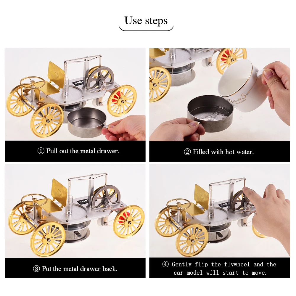 【Как использовать 】:Заполненный горячей водой не менее 70 ℃ в нижний металлический ящик, аккуратно переверните маховик, и модель автомобиля начнет двигаться. Чем больше разница в температуре, тем больше энергии она будет иметь.
