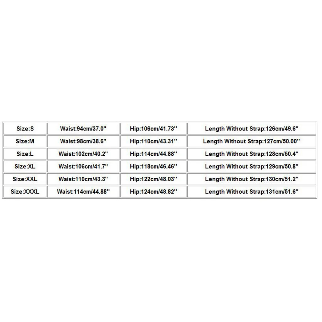 Размер Талия Бедра Длина без ремешка S 94 см/37,0" 106 см/41,73'' 126 см/49,6" М 98 см/38,6" 110 см/43,31'' 127 см/50,00'' L 102 см/40,2" 114 см/44,88'' 128 см/50,4" XL 106 см/41,7" 118 см/46,46'' 129 см/50,8" XXL 110 см/43,3" 122 см/48,03'' 130 см/51,2" XХХL 114 см/44,88'' 124 см/48,82'' 131 см/51,6"