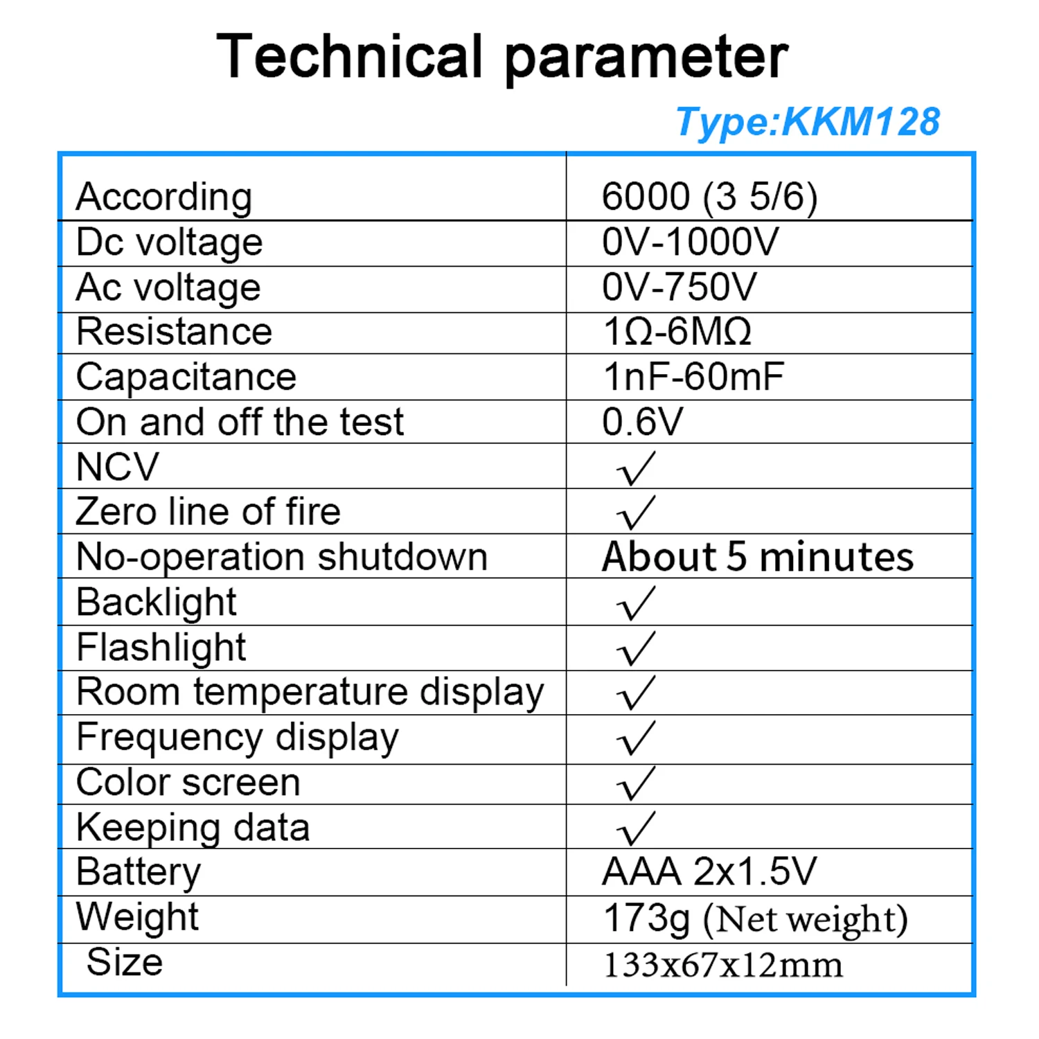 Функция: тест на напряжение, Частотный тест, тест на емкость, тест на сопротивление, диодный тест, распознавание пожарного провода, фонарик, электрическое поле, звуковой сигнал, истинный RMS, автоматическое отключение, хранение данных.