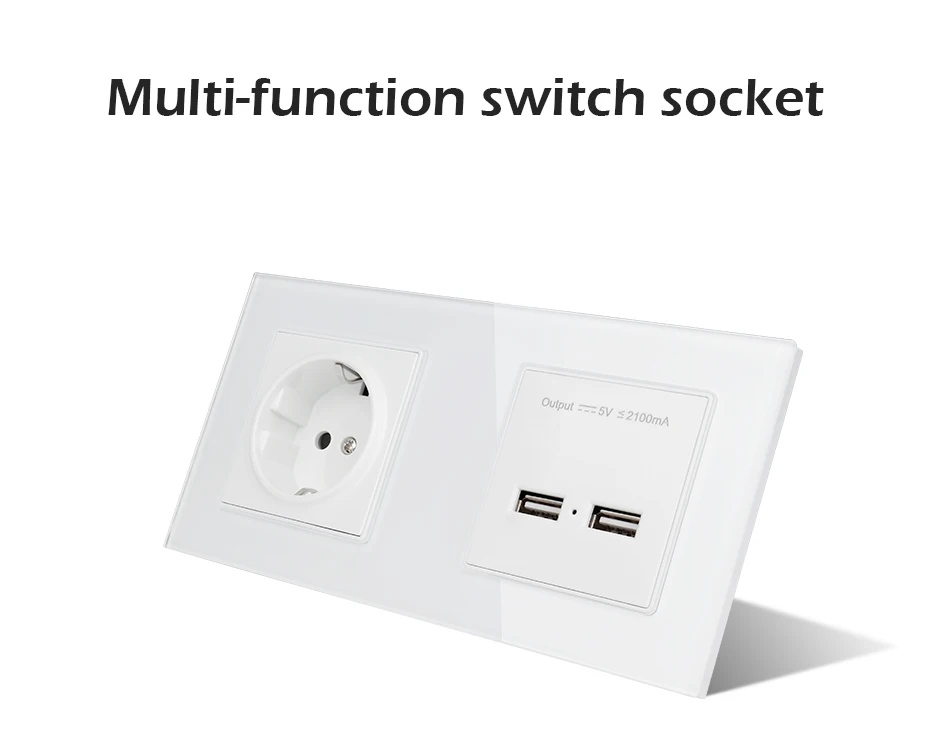 Esooli настенная Хрустальная стеклянная панель, 2 банды, розетка с заземлением 16А, Европейская электрическая розетка с двойным USB портом для смарт-зарядки, 5 В, 2 А