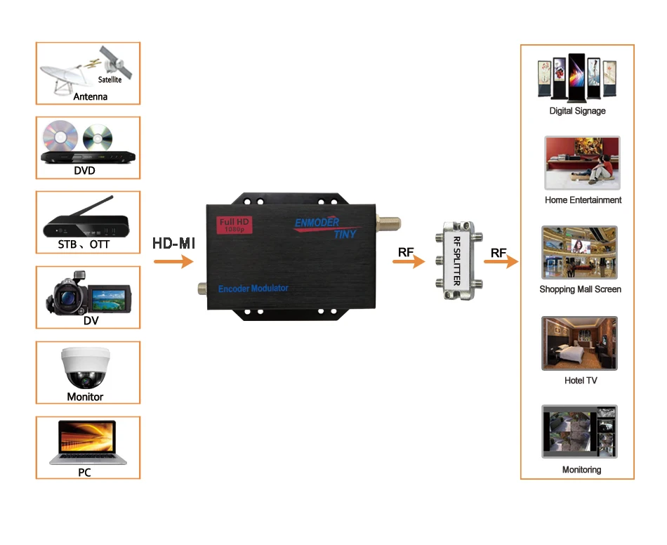 Этот модулятор используется для подачи аудио-видео сигналов через разъем HD-MI в коаксиальную кабельную сеть. Сигналы формируют камеры наблюдения, медиаплееры, спутниковые приемники или компьютеры. Сигнал радиочастотно-модулирован и доступен для любого количества Приемников (ТВ, телеприставка) на большие расстояния.