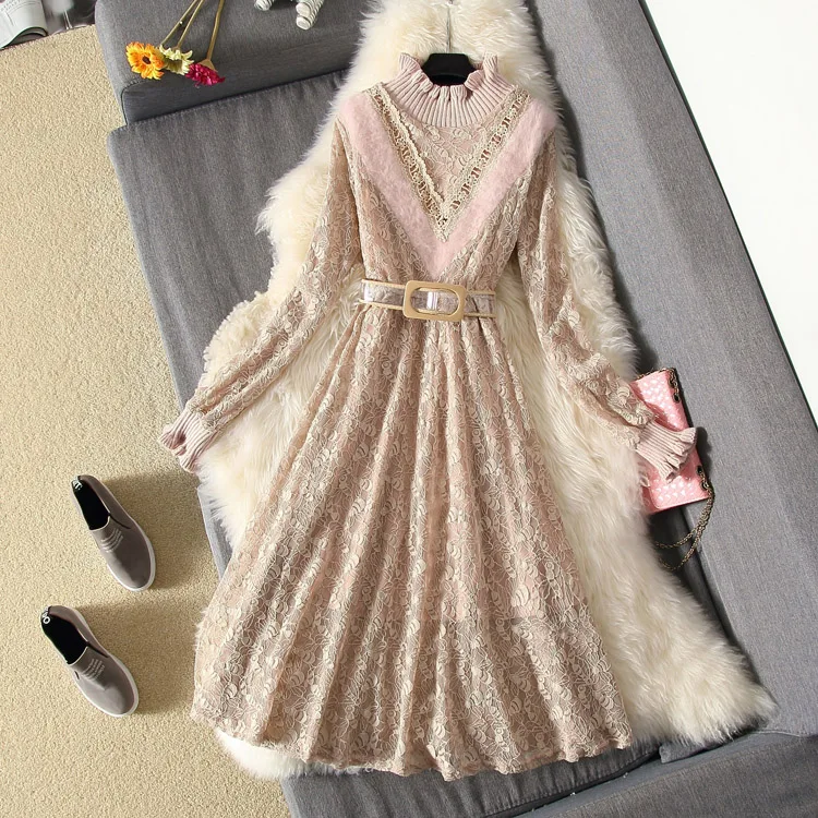 Женское трикотажное кружевное платье с длинным рукавом, облегающее длинное платье-свитер, весна 2019