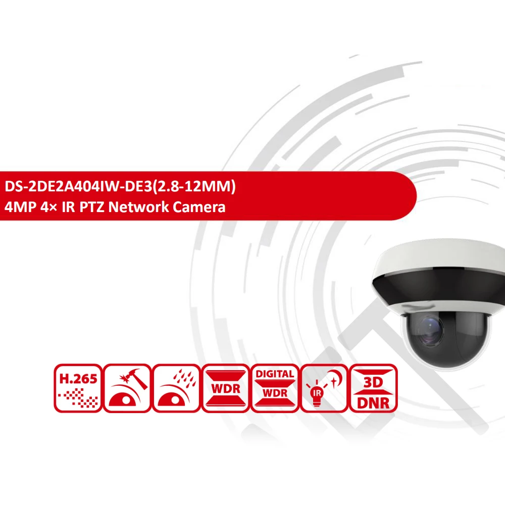 4 MP IR Fixed Dome PTZ Network Camera 1.4MP 4× IR Network PTZ Camera 2.1/3" progressive scan CMOS 3.Up to 2560 × 1440 25fps resolution 4.Min. illumination: Color: 0.005 Lux @(F1.6, AGC ON) B/W: 0.001 Lux @(F1.6, AGC ON) 0 Lux with IR5.4× optical zoom, 16× digital zoom 6.120 dB WDR, 3D DNR, HLC, EIS, Regional Exposure, Regional Focus 7.12 VDC & PoE 8.Up to 20 m IR distance 9.IK10, IP66 10.Support H.265+/H.265 video compression