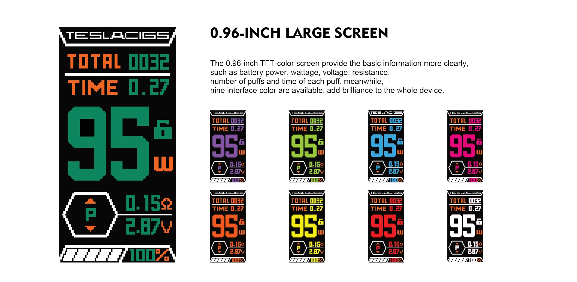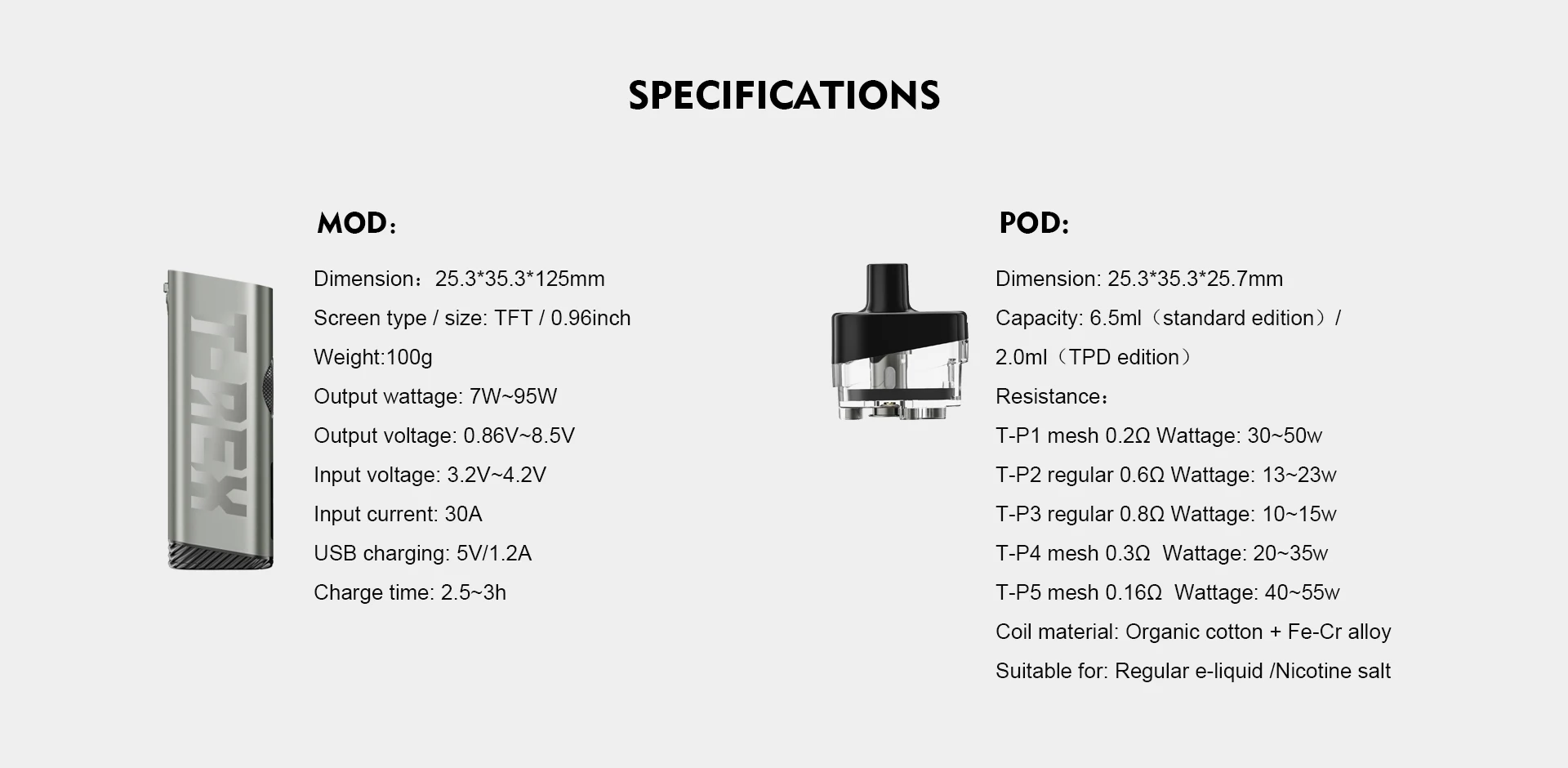 1. 6,5 мл большая емкость pod, налив сверху система с защитой от детей замок 2. Совместим с одним аккумулятором 21700/20700/18650 3. Принимает пять различных типов катушек: T-P серии катушек 4. 95 Вт VW Mod с регулируемым контролем воздушного потока 5. Первая кнопка «Два в одном», вращающаяся и нажимающая, чтобы реализовать все функции 6. 0,96 дюймовый цветной дисплей TFT, быстрый зарядный порт Type-C