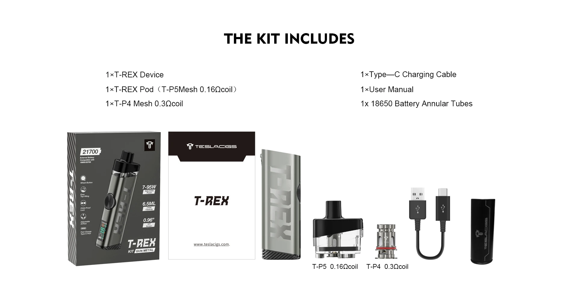 1 * T-REX устройство 1 * T-REX Pod 1 * T-P5 сетка 0,16 Ом DL катушка 1 * T-P4 сетка 0.3ohm DL катушка 1 * Адаптер аккумулятора 18650 1 * кабель Type-C 1 * Руководство пользователя 1 * Гарантийный талон