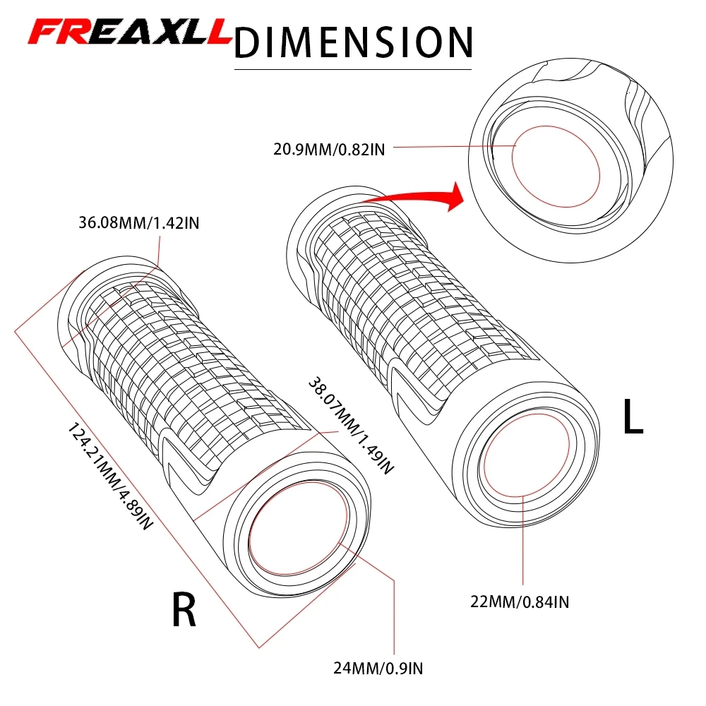 Ручки для 7/8 ''(22 мм) левого руля и 1''(24 мм) правого руля комфортные ощущения, противоскользящий дизайн, простота установки.
