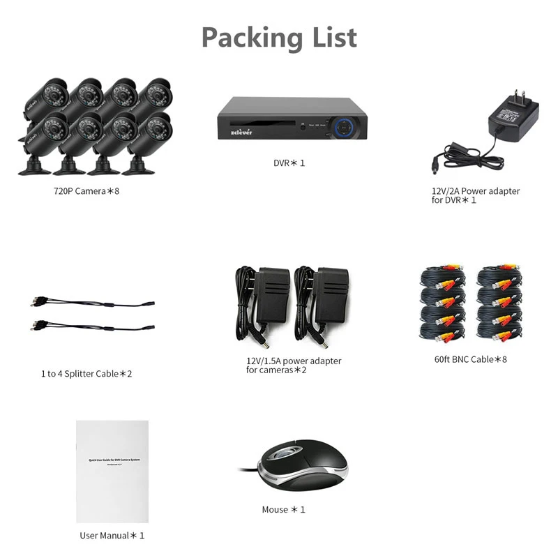1 x 8CH DVR (без HDD / 1 ТБ HDD для опционально) Цилиндрическая камера 4/8x720P 4/8x60 футов (18,3 м) видео BNC кабель питания 1/2 х 4-в-1 Мощность сплиттер 1/2x12V/1.5A адаптер питания для камеры 1x12V/2A адаптер питания для DVR 1 х USB Мышь 1 х Guid быстрого пользователя