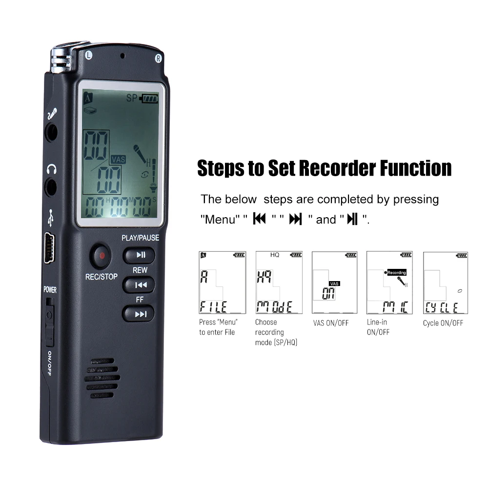 SK-301 диктофон поддерживает запись голоса (VAR) и запись телефонных разговоров. 1536 кбит/с для очень высокого качества звука. Вы можете воспроизводить повторы/A-B повторения/пропустить вперед/назад/Пауза/удаление и т. д. Встроенная память 8 Гб поддерживает запись до 10 часов, встроенный аккумулятор емкостью 300 мАч поддерживает запись до 10 ч. Отлично подходит для записи лекций, встреч, телефонных интервью и т. д.