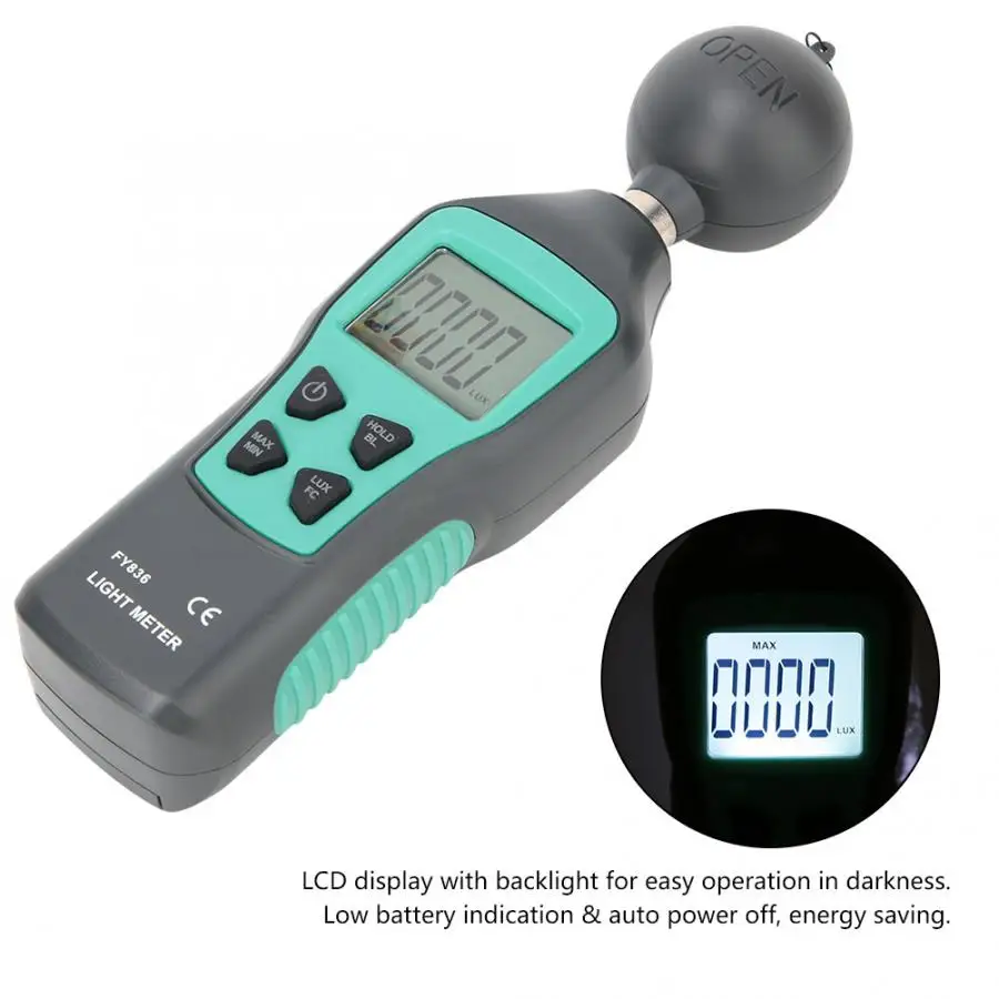 Мини luxmeter с стабильным, безопасным и надежным измерением. Широкий диапазон измерения 0-200K lx и 0Fc-20KFc с переключаемым измерительным блоком Lx или Fc. Максимальная / Минимум/Функции хранения данных, высокая точность. ЖК-дисплей с подсветкой для удобства работы в темноте. Индикация низкого заряда батареи и автоматическое отключение питания, энергосбережение.