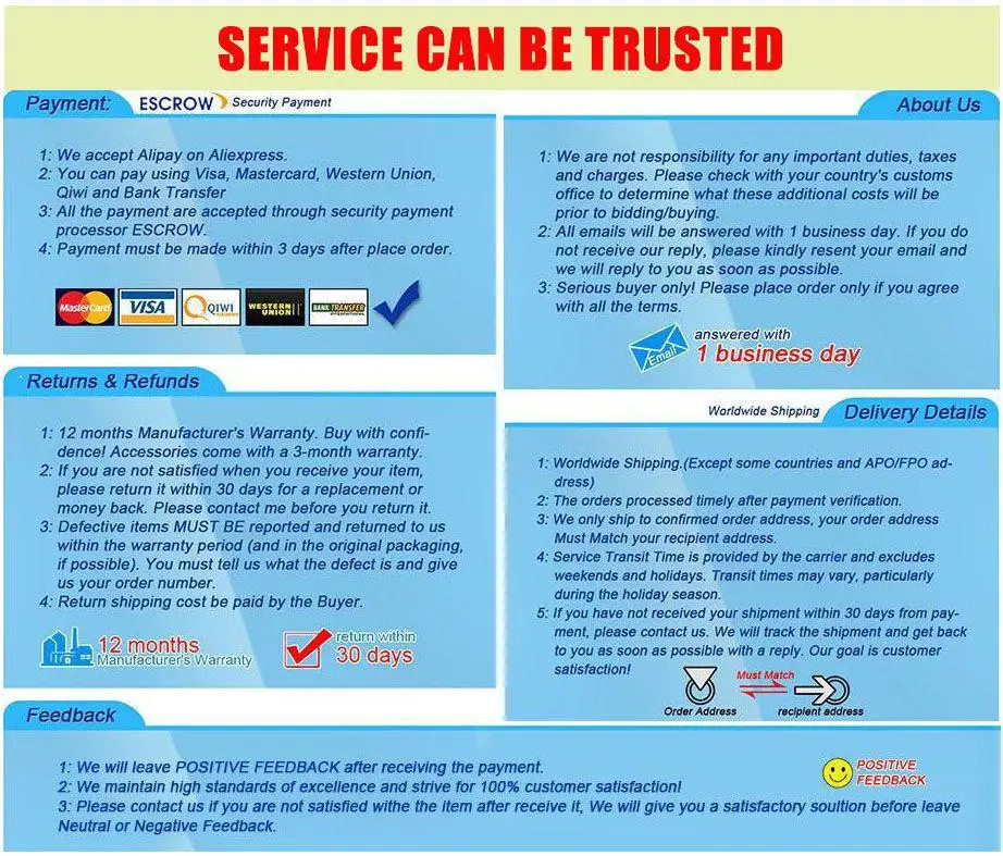 Мы предоставляем вам лучший продукт и сервис. Если у вас есть какие-либо проблемы, пожалуйста, дайте нам знать, и мы решим проблему как можно скорее. Большое спасибо.