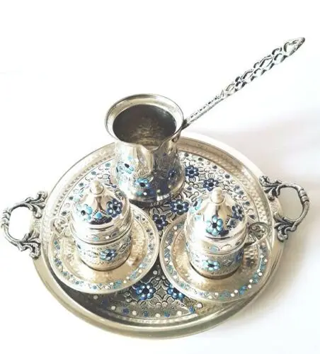 Турецкая Роскошная Османская ручная роспись медный кофе и Эспрессо набор из 2 с кофейником и лотком -Только ручная Покрашенный набор -Можно использовать в качестве декоративного элемента -Ручной работы товара -Фарфоровая чашка высокого качества -Ручной работы на основе толстого медного -Ручная роспись -Украшенные анатолийский мотивы -Гравировка, нажав на гравер -В комплект входит кофейник -Декорированные турецкие цветы Размеры: -Высота чашки: 3,54 "(9 см) -Блюдце диаметр: 3,94 "(каблук 10 см) -Лоток Диаметр: 10,04 "(25,5 см) -Кофе горшок высота: 3,54 "(9 см) -Объем кофейника: 4,73 унций (140 мл) -Общий вес: 28,22 унций (800 гр) ========================================================= Посылка включает: -2 медные кофейные чашки -2 медных блюдца -2 штуки высокого качества porcelains -1 шт. лоток -1 шт. кофейник Пожалуйста, обратите внимание на то, что все наши товары изготавливаются 100% ручной работы. В связи с характером наших изделий ручной работы, некоторые неровности считаются нормальными, и два изделия не идентичны. Некоторые дизайны и цвета могут незначительно отличаться от фото и кусков.