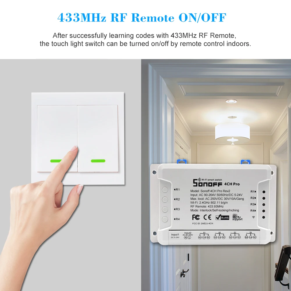 Sonoff 4CH Pro ITEAD интегрируется с модулем радиочастотного приемника 433 МГц, что позволяет управлять переключателем с помощью радиочастотного пульта. Это 4-канальный универсальный Wi-Fi беспроводной коммутатор для вашей системы «умный дом», чтобы удаленно и автоматически включается включения/выключения бытовых приборов и электронных устройств по железной дороге для Android/iOS App или 433 МГц RF пульт дистанционного управления. Он также поддерживает включение/выключение устройств в определенное время и делиться ими с другими, чтобы вы могли контролировать свой умный дом вместе с семьей. Вы также можете управлять голосом вашей бытовой техники, совместимой с Amazon Alexa, и для Google home/Nest, и наслаждаться умной жизнью и сделать ваш дом умнее.