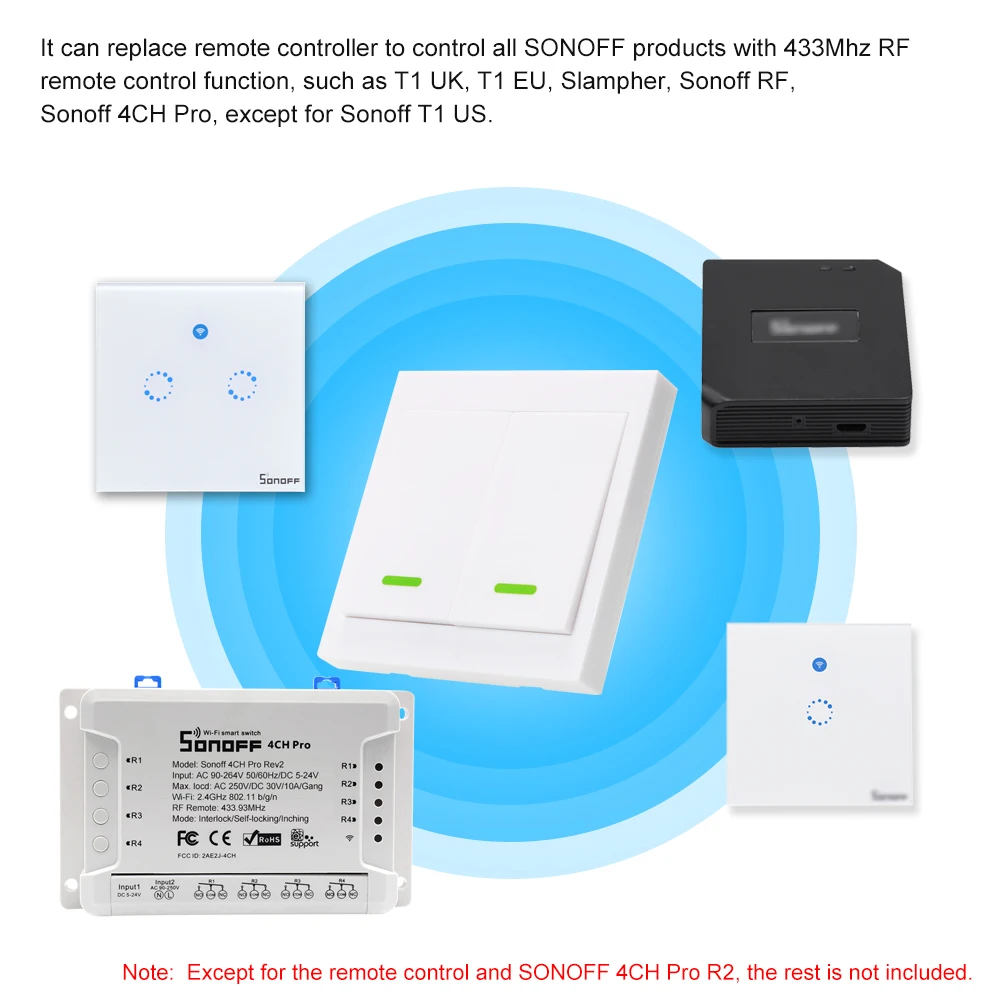 * Он может заменить пульт дистанционного управления для управления всеми продуктами SONOFF с функцией дистанционного управления 433 МГц RF, такими как T1 UK, T1 EU, Slampher, Sonoff RF, Sonoff 4CH Pro, за исключением Sonoff T1 US.