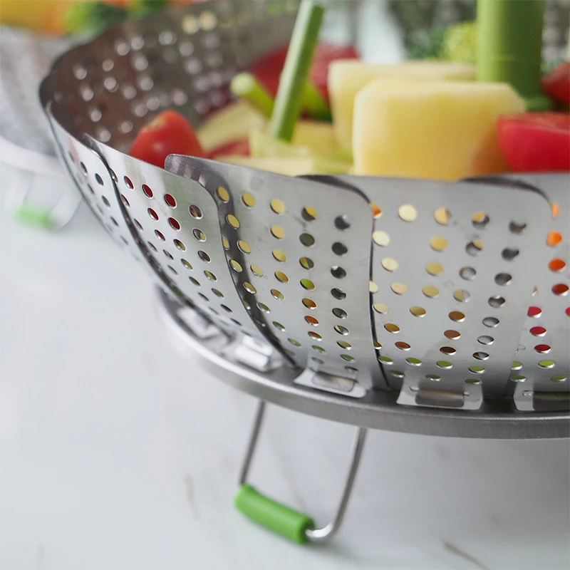 1: корзина для отпаривателя с лепестками из высококачественной нержавеющей стали, пластиковая ручка для пищевых продуктов и силиконовые ножки гарантируют ваше здоровье.