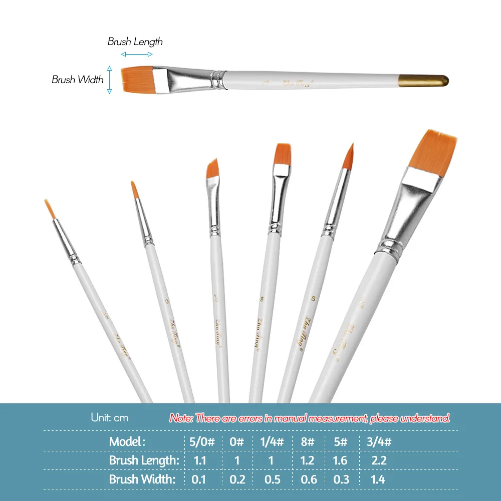 6 кистей:В комплекте 6 кистей различной формы и размера, гибкая и мягкая Нейлоновая Щетка для волос, алюминиевый ободок, эффективно защищает головку кисти от падения, прочные деревянные ручки для удобного управления.