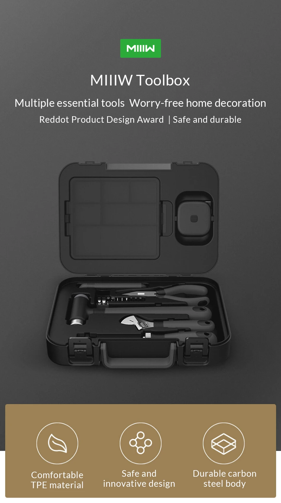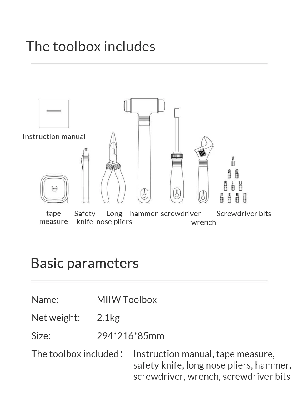 Название: MIIW ящик для инструментов Вес нетто: 2,1 кг Размер: 294*216*85 мм Набор инструментов: Инструкция по эксплуатации, рулетка, нож безопасности, плоскогубцы, молоток, отвертка, гаечный ключ, отвертка