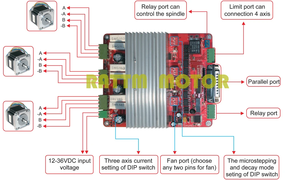 Он может управлять тремя осями, 4ThПеремещение по оси расширения, чтобы облегчить ваши потребности 4-осевой обрабатывающий при работе Выходное реле шпинделя, простое в использовании программное обеспечение, такое как mach3 для управления запуском и остановкой шпинделя. Функции управления полупотоком и эффективность остановки двигателя, когда ток уменьшен до минимального. Интерфейс с вентилятором, вы можете добавить вентилятор по вашему выбору. С 3 Проводами 0,8-3.5A (Пиковый) Номинальный выход двухфазного регулируемого тока биполярного шагового двигателя привода; Стандартный интерфейс параллельного порта, поддержка программного обеспечения серии MACH2, KCAM4; С оптической изоляцией и изоляцией источника питания постоянного тока, полной защитой вашего компьютера параллельного порта и оборудования; С концевым переключателем, можно подключить 4 aixs концевой выключатель Поддержка четырех микрошаговых -- 1,1/2,1/8,1/16 12-36 в одиночный импульсный источник питания, микрочипы для использования в качестве источника питания 5 В, стабильный и маленький нагрев Используя RC + 7414 автоматический полупоток, ток автоматически уменьшается, когда шаговый двигатель останавливается, чтобы уменьшить тепло2. Шаговый двигатель