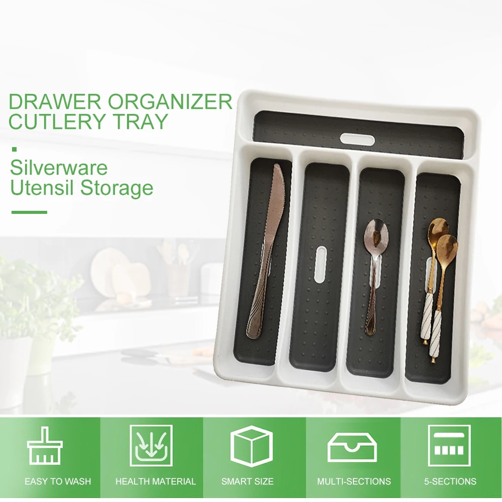 Наши столовые приборы лоток 6 отсеков лоток, который плотно прилегают кЛюбая кухня поможет вам в организации столовых приборов и посуды. Закругленные углы и внутренняя мягкая подкладка делают этот лоток из серебра очень функциональным, простым в очистке и эстетически приятным. К вашим услугам Нескользящие резиновые ножки и подкладка с мягким захватом для обеспечения того, чтобы предметы оставались на своем месте. Изготовлен из высококачественного, без BPA пластика.