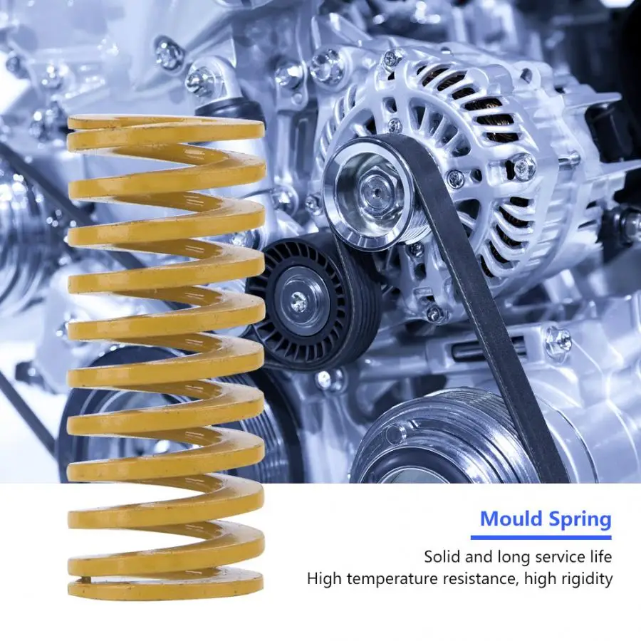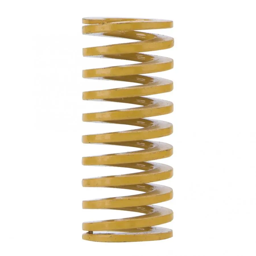 Пружины пресс-формы в основном используются для машинного оборудования. Ее внутренний диаметр составляет половину наружный диаметр в целом. Для пружин, желтый цвет означает, что класс нагрузки-это нагрузка на светильник. Кроме того, самые тяжелые штамповочные пружины сделаны в коричневом цвете. Широко используется для штамповочных штампов, штампов для литья металла, пластиковых штампов, а также других эластичных машин и оборудования для движения, в автомобильной области.