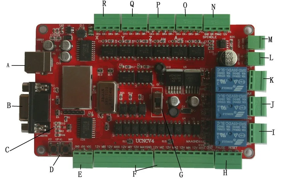 A) USB интерфейс, подключите к компьютеру usb-порт через этот интерфейс, вы можете использовать программное обеспечение usbcnc для управления этой платой, Этот USB интерфейс является квадратным B интерфейсом, пожалуйста, используйте кабель USB2.0 для подключения с защитой и магнитной защитой и длиной не более 2 метров.