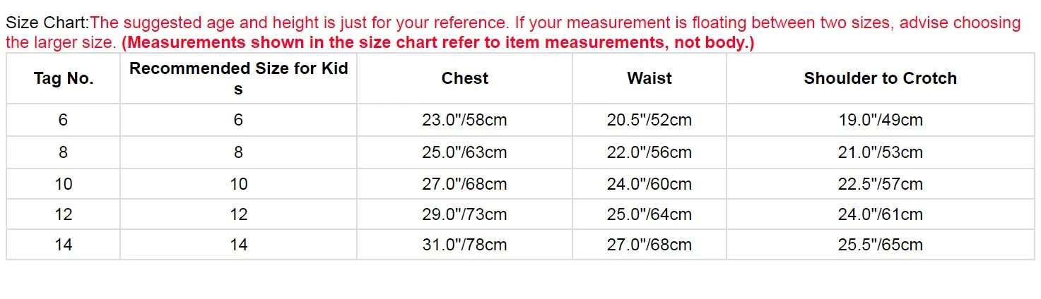 Размер на бирке. Рекомендуется Размеры для детей Обхват груди Обхват талии Длина от плеча до паха 6 6 23,0 "/58 см 20,5 "/52 см 19,0 "/49 см 8 8 25,0 "/63 см 22,0 "/56 см 21,0 "/53 см 10 10 27,0 "/68 см 24,0 "/60 см 22,5 "/57 см 12 12 29,0 "/73 см 25,0 "/64 см 24,0 "/61 см 14 14 31,0 "/78 см 27,0 "/68 см 25,5 "/65 смПолезные советы: Замеры делаются вручную, поэтому учитывайте небольшие погрешности. Цвет на фото может немного отличаться от реального товара из-за особенностей цветопередачи различных мониторов.
