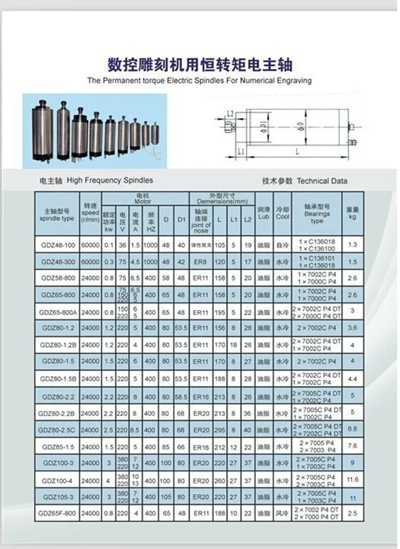 1 x двигатель шпинделя с водяным охлаждением 1,5 кВт(ER11, 220 В, 400 Гц, 24000 об/мин, 80x188 мм, 3 подшипника)