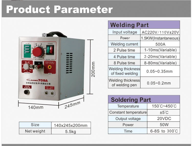 Сварные части Входное напряжение: ac220в/110 В + 20 в Мощность: 1,5 кВт (мгновенный Сварочный ток: 500A 2 импульса: 1-10 мс (переменная) 4 импульса: 2-20 мс (переменная 8 импульсов: 8-80 мс (переменная) Толщина сварки фиксированная Сварка: 0,05 ~ 0,35 мм Толщина сварочной ручки: 0,05 ~ 0,2 мм Сварные части Температура: 150 °C ~ 450 °C Постоянная температура: ± 5 °C Выход напряжение: 20VDC Мощность: 50 Вт Время нагрева: от 6 до 8 с до 300 градусов Цельсия