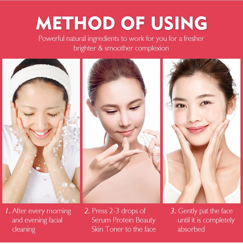 Мощные натуральные ингредиенты, чтобы работать для вас на более свежий и более яркий и гладкий цвет лица I. После ежедневной и вечерней чистки лица 2. Нажмите 2-3 капли Сывороточного Белка BeautySkin Toner на лицо 3. Аккуратно погладьте лицо до полного впитывания